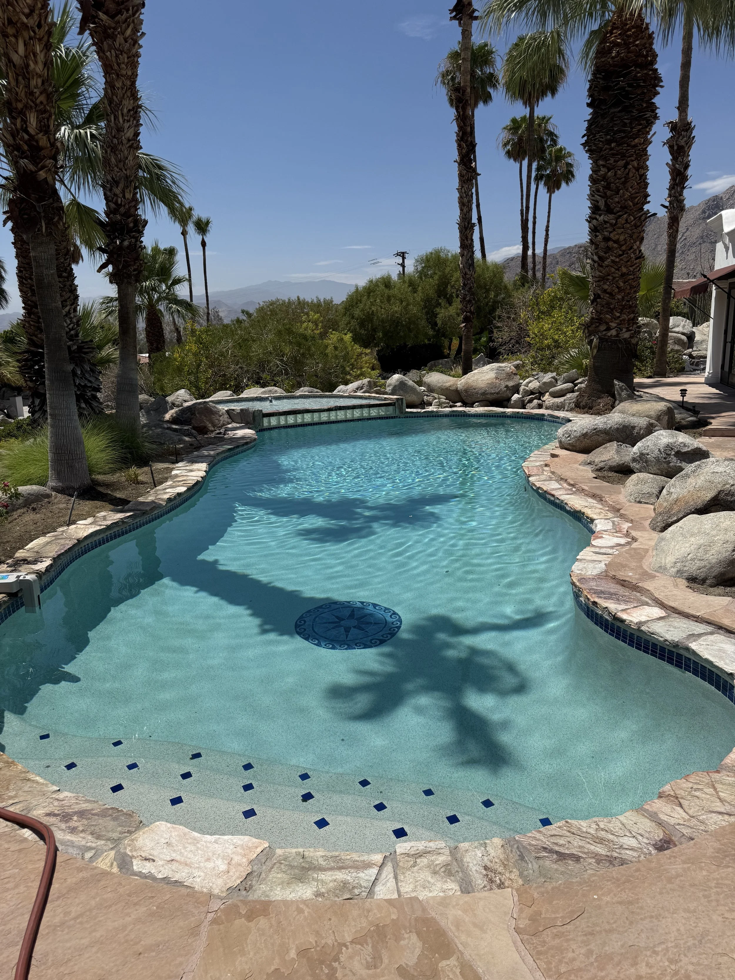 Backyard pool with hot tub, mountains in background, palm trees, and modern patio furniture.
